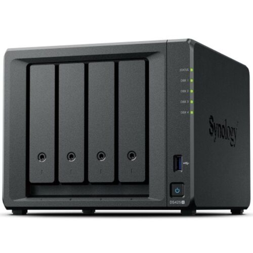 El DS425+ cuenta con redes integradas de 2.5GbE y admite tanto SSD SATA como HDD en bahías internas de 2.5"/3.5", así como unidades M.2 NVMe a través de ranuras M.2 para uso de caché